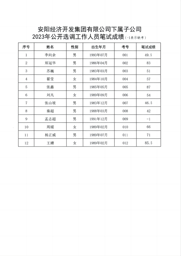 安陽經(jīng)濟開發(fā)集團有限公司下屬子公司2023年公開選調(diào)工作人員筆試成績公示