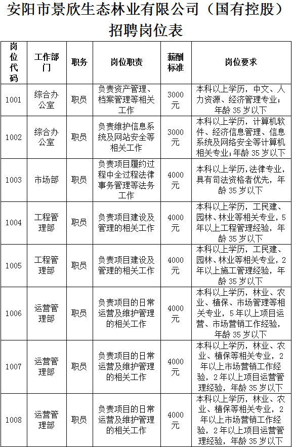 根據(jù)工作發(fā)展需要,現(xiàn)委托安陽鼎泰勞務(wù)派遣有限責(zé)任公司面向社會(huì)公開招聘8名員工,派遣至安陽市景欣生態(tài)林業(yè)有限公司工作。現(xiàn)將有關(guān)事項(xiàng)公告如下: