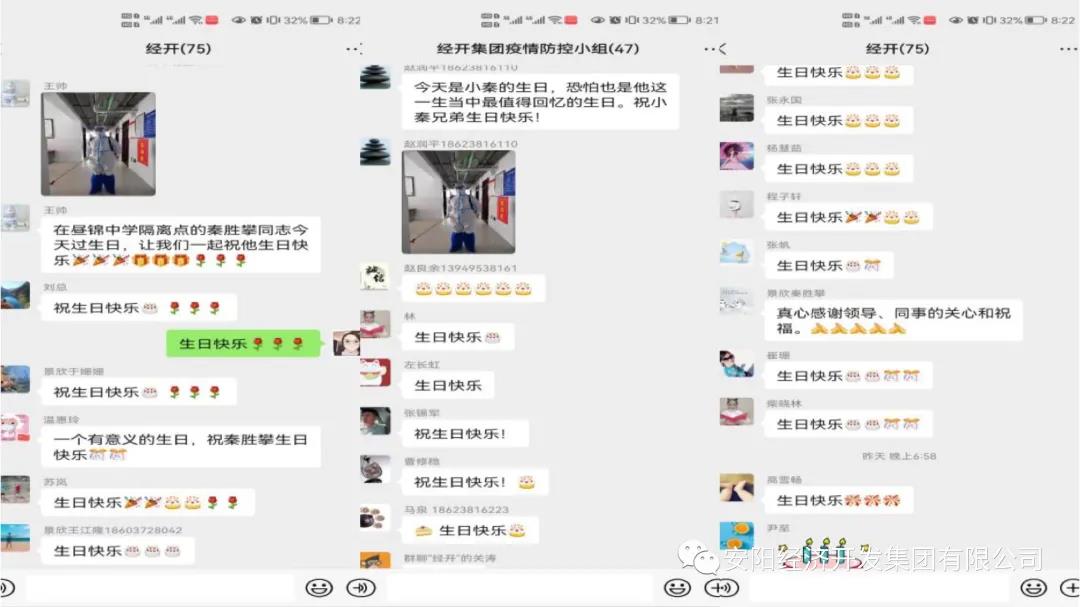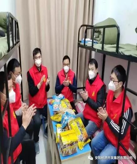1月25日,是經(jīng)開集團志愿者秦勝攀34歲的生日。在晝錦中學隔離點,他向往常一樣重復著為隔離人員配送生活物資、清理垃圾、環(huán)境消殺等工作。下班后在宿舍出現(xiàn)了暖心的一幕:在這個特殊的時期、特殊的地方、特殊的環(huán)境,沒有蠟燭、沒有蛋糕,但有特殊的“家人”陪他一起過生日?!凹胰恕眰兗娂姳硎緪坌?,送上了溫暖的祝福。